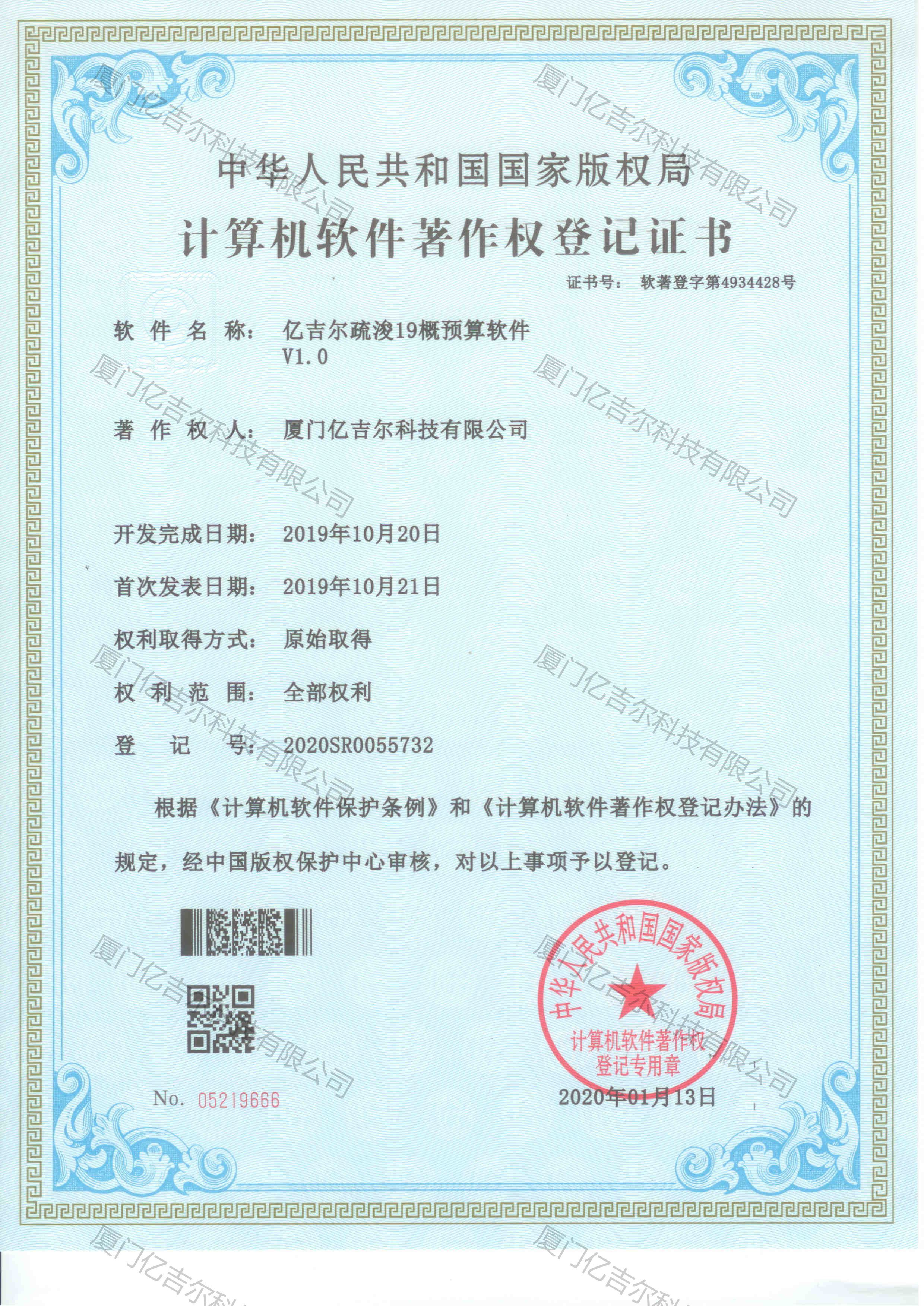 億吉爾疏浚19概預(yù)算軟件著作權(quán)登記證書 發(fā)布日期:2020年01月13日 瀏覽次數(shù):5053 關(guān)鍵字: 公司 1/1億吉爾疏浚19概預(yù)算軟件著作權(quán)登記證書