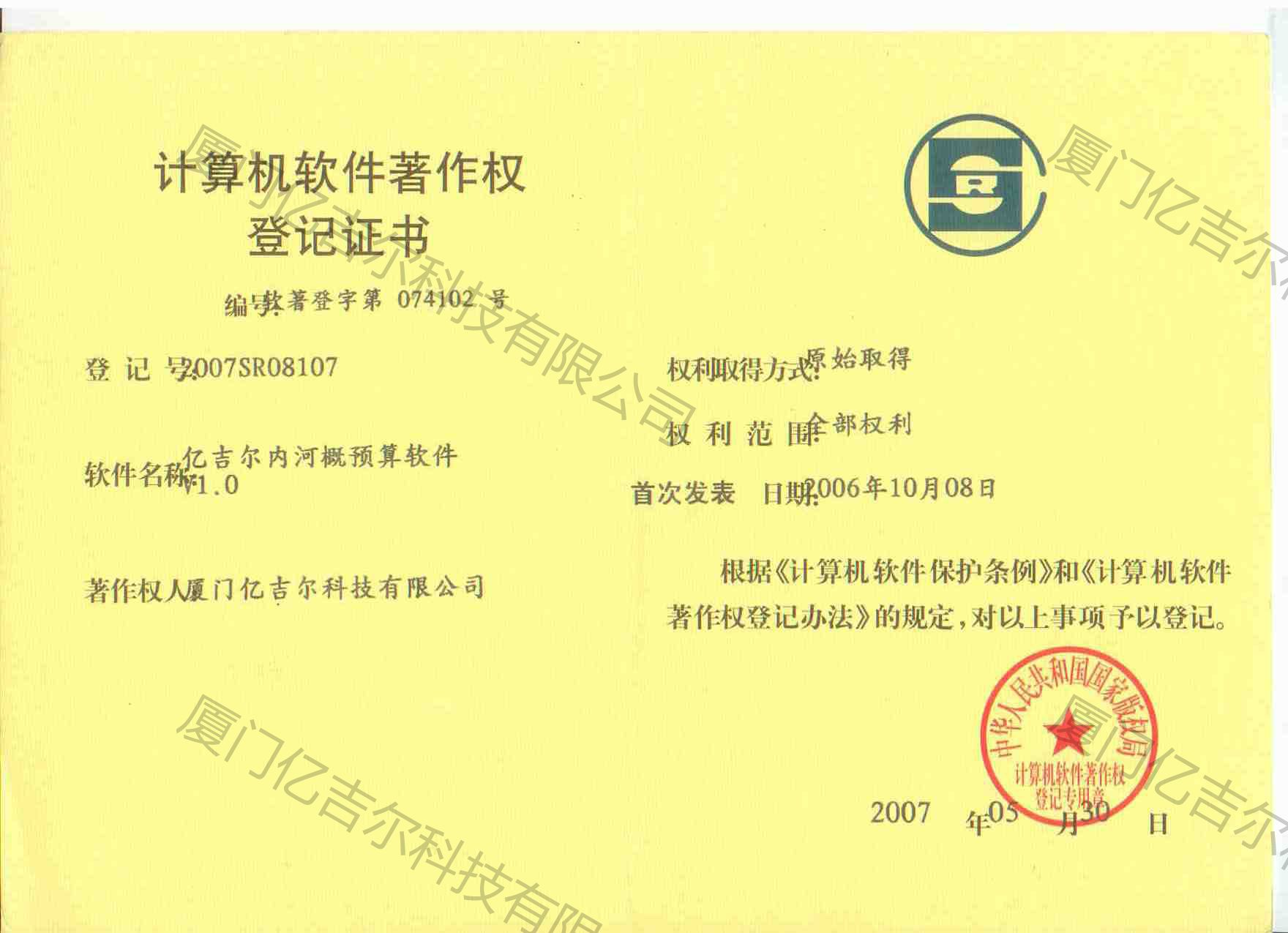 億吉爾內(nèi)河概預算軟件著作權(quán)登記證書 發(fā)布日期:2007年05月30日 瀏覽次數(shù):4016 關(guān)鍵字: 公司 1/1億吉爾內(nèi)河概預算軟件著作權(quán)登記證書