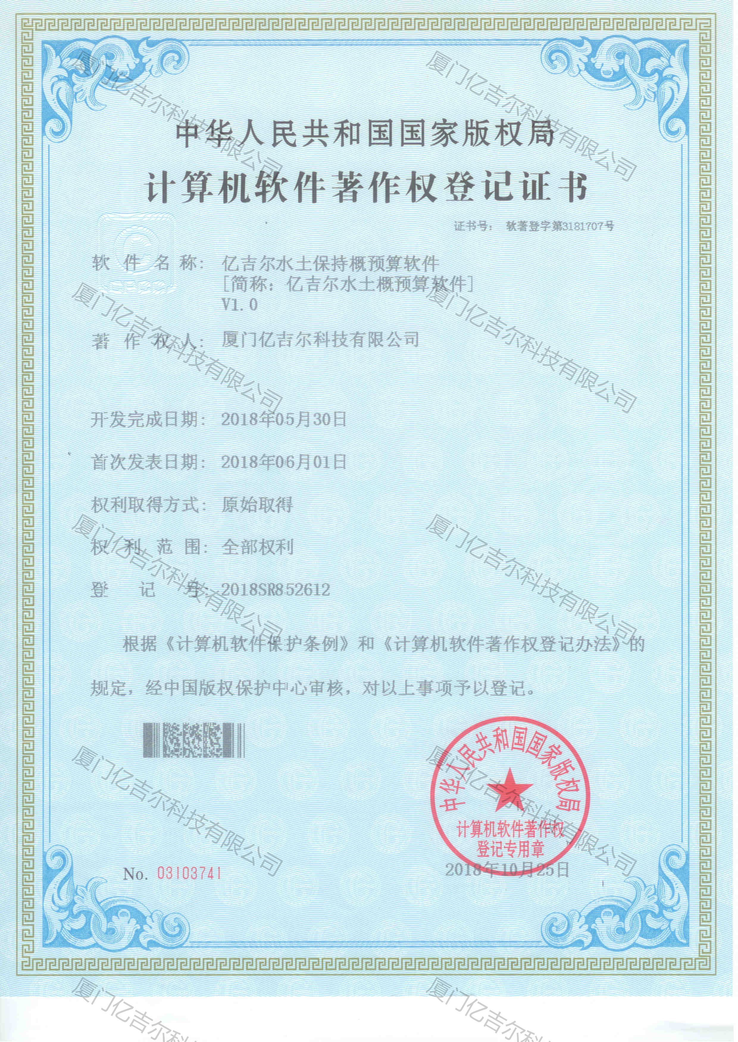 億吉爾水土保持概預(yù)算軟件著作權(quán)登記證書 發(fā)布日期:2018年10月25日 瀏覽次數(shù):4407 關(guān)鍵字: 公司 1/1億吉爾水土保持概預(yù)算軟件著作權(quán)登記證書